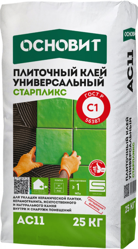 Универсальный плиточный клей Основит Старпликс AC11 предназначен для облицовки оснований стен и полов с подогревом керамической плиткой, натуральным и искусственным камнем весом до 600 г/100 см².